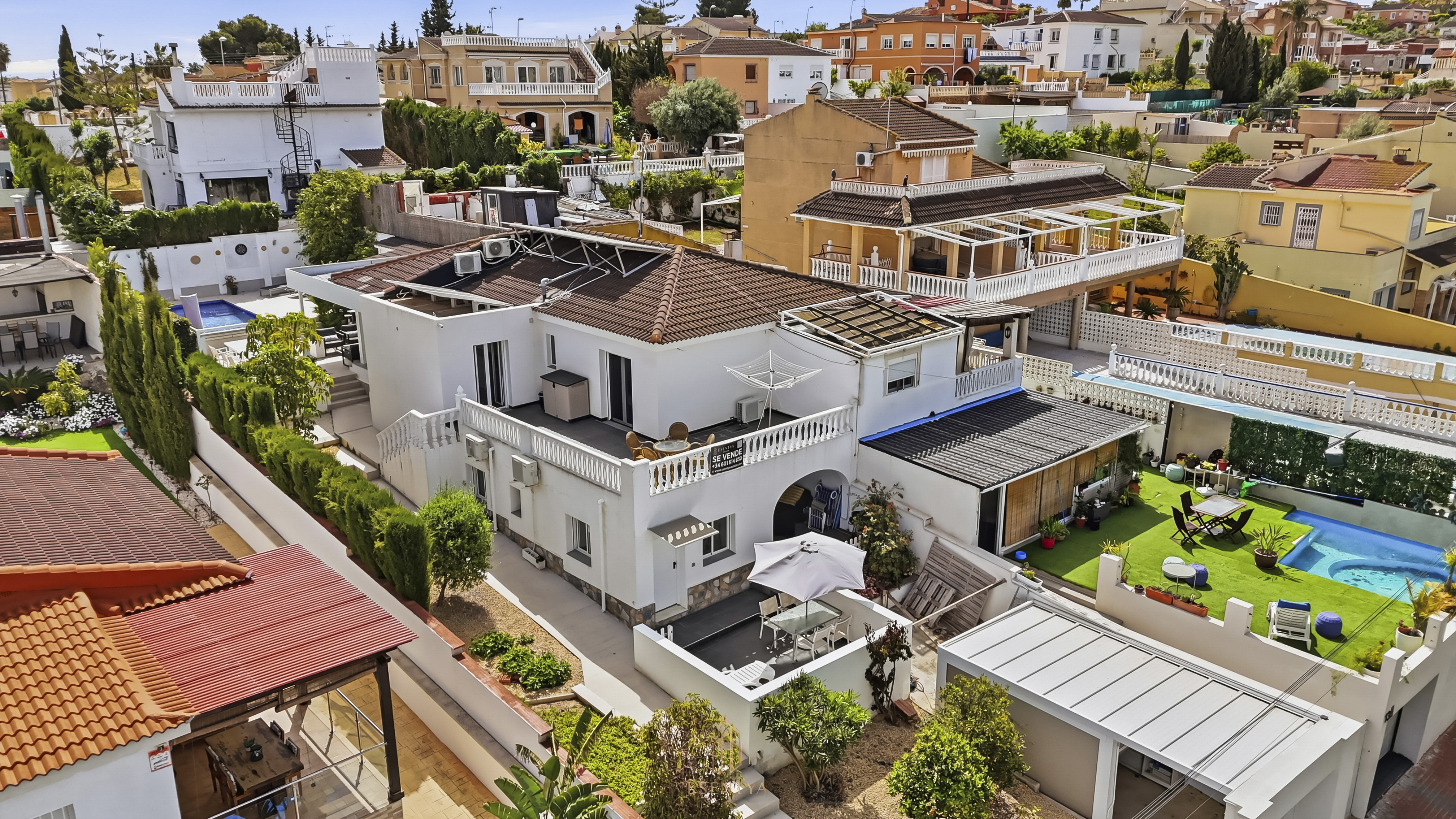 Semi-detached villa with private pool and independent apartment in Los Balcones, Torrevieja. Property distributed over two independent floors, ideal for family use or investment with tourist rental. It includes a separate apartment with tourist license, featuring 2 bedrooms, 1 bathroom, living room, kitchen, terrace and air conditioning. The main house offers 1 bedroom with en-suite bathroom, possibility of a second bedroom, guest bathroom, fully equipped modern kitchen, living room and terrace. Set on a 462 m² plot with garden, heated private pool and several terraces with park views. Located in a quiet residential area close to services and Torrevieja town center. Key features 3 bedrooms 3 bathrooms 170 m² built 462 m² plot Property on 2 independent floors Independent apartment with tourist license Private heated swimming pool Garden Several terraces Park views East orientation (pool) and west (main façade) Modern equipped kitchen Air conditioning Semi furnished Double glazed windows Modern style 12 solar panels Garage (ready for electric vehicle) Quiet residential area Close to hospital Natural surroundings Walking distance to shops, bars and restaurants Close to Torrevieja and Orihuela Costa center Annual costs: IBI: €560